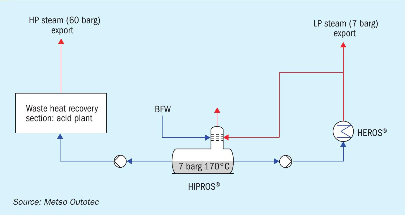 Metso Outotec’s new HIPROS™ design overcomes the problem of low temperature BFW entering the economisers, thus eliminating dew point problems and corrosion in the economisers. The deaerator in the HIPROS™ design is pressurised to 9-10 bar and the BFW temperature is about 180°C entering the economisers, instead of the typical 105°C. This ensures a wide temperature margin between the tube wall temperature and typical gas dewpoint. This higher temperature also leads to higher high pressure steam generation (around 11% increase over conventional design).