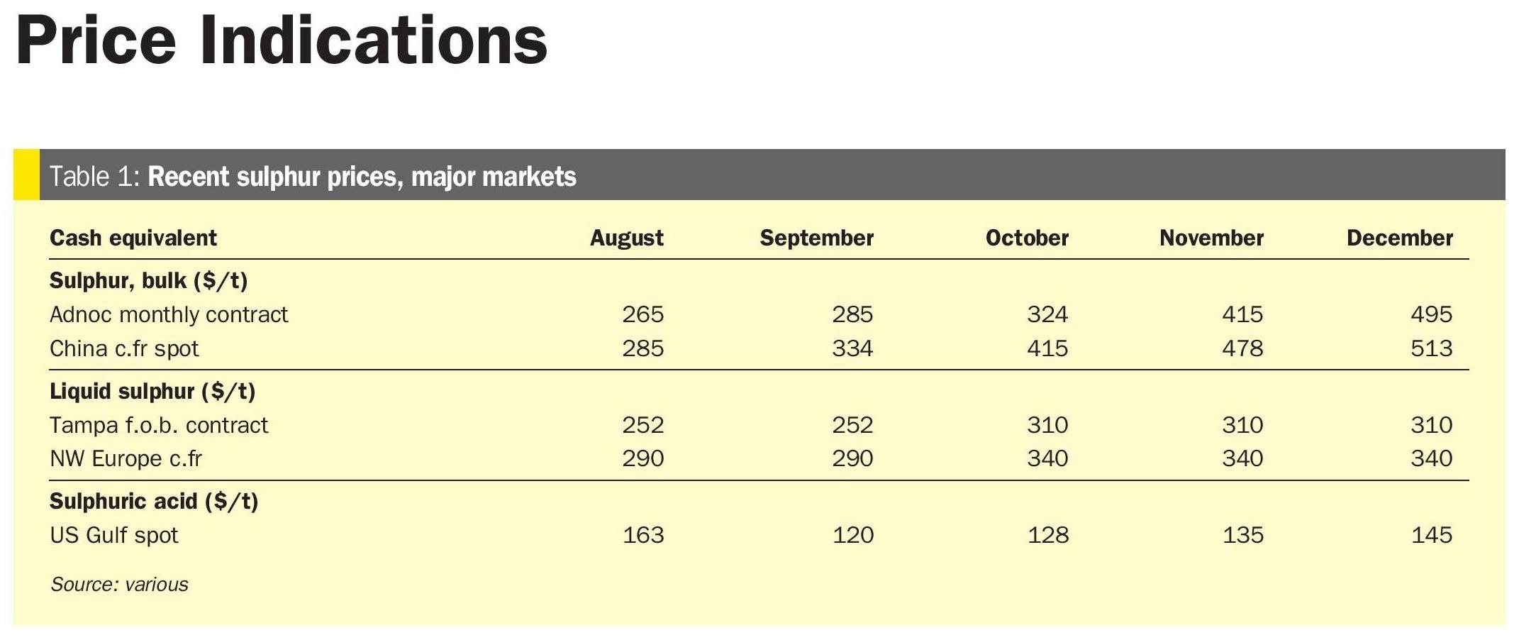 - Outlook: The price downturn is expected to turn to stability by the second quarter with incremental recovery expected. With sulphur prices stable to soft in the short term, this may encourage buyers to the acid market during this period. The rate and pace of Chinese smelter acid capacity additions will be a key influence for the short term outlook as well as the return of China to the processed phosphate export market.