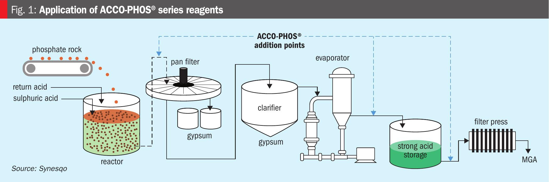 Using proprietary chemistry, ACCO-PHOS® forms an insoluble complex with heavy metals in the acidic solution. Advantageously, the reagents can be applied at multiple points of the phosphoric acid production and purification process, as shown in Figure 1.