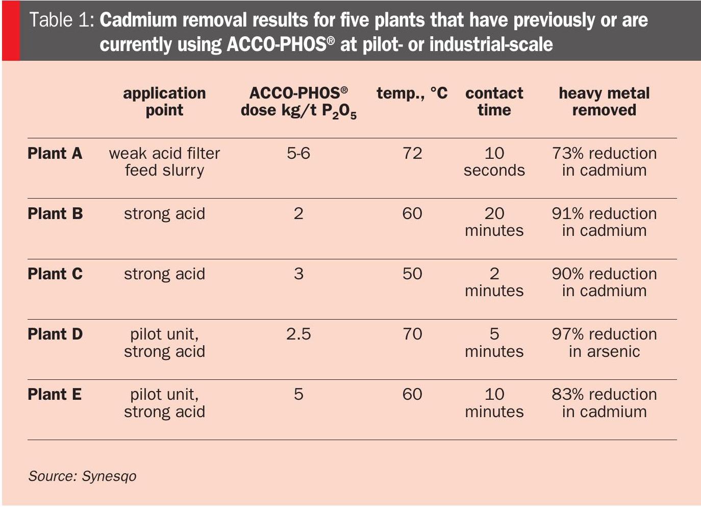 ACCO-PHOS® technology has been proven at an industrial scale, with multiple plants consistently purchasing commercial quantities to purify phosphoric acid. Table 1 provides a list of plants that have used, or are currently using, ACCO-PHOS® at pilot- or industrial-scale, together with pertinent application details and performance results for cadmium removal.