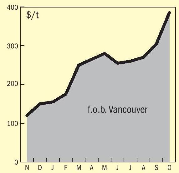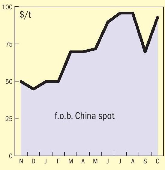 In October, the northwestern European f.o.b. level edged higher but still remained $37/t down from the peak seen in mid-June at $135/t f.o.b. Availability in the region has started to tighten up despite muted Moroccan demand, with December shipments now reported at $90-95/t f.o.b. Fresh spot interest is now centred on December and January loadings. For secondhalf December into early January, indications have been pegged as high as $100/t f.o.b., with near-term CFc.frR ideas around $105/t. Reported December loadings were $90–100/t f.o.b. Near-term sentiment is bullish, with tight spot supply supporting further gains.