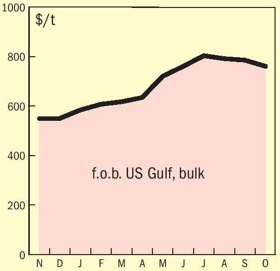 Sulphur prices advanced further in October, more than expected, supported by the supply towards the end of summer becoming restricted, with a number of non-mainstream sources facing logistical constraints. Russian supply was cut due to drone strikes at the Astrakhan and Orenburg gas plants in early September. Exports of sulphur from Russian ports fell from around 400,000 tonnes per month to 100,000 tonnes in October. Bullish pricing prevailed, with higher benchmark prices from China and Indonesia.