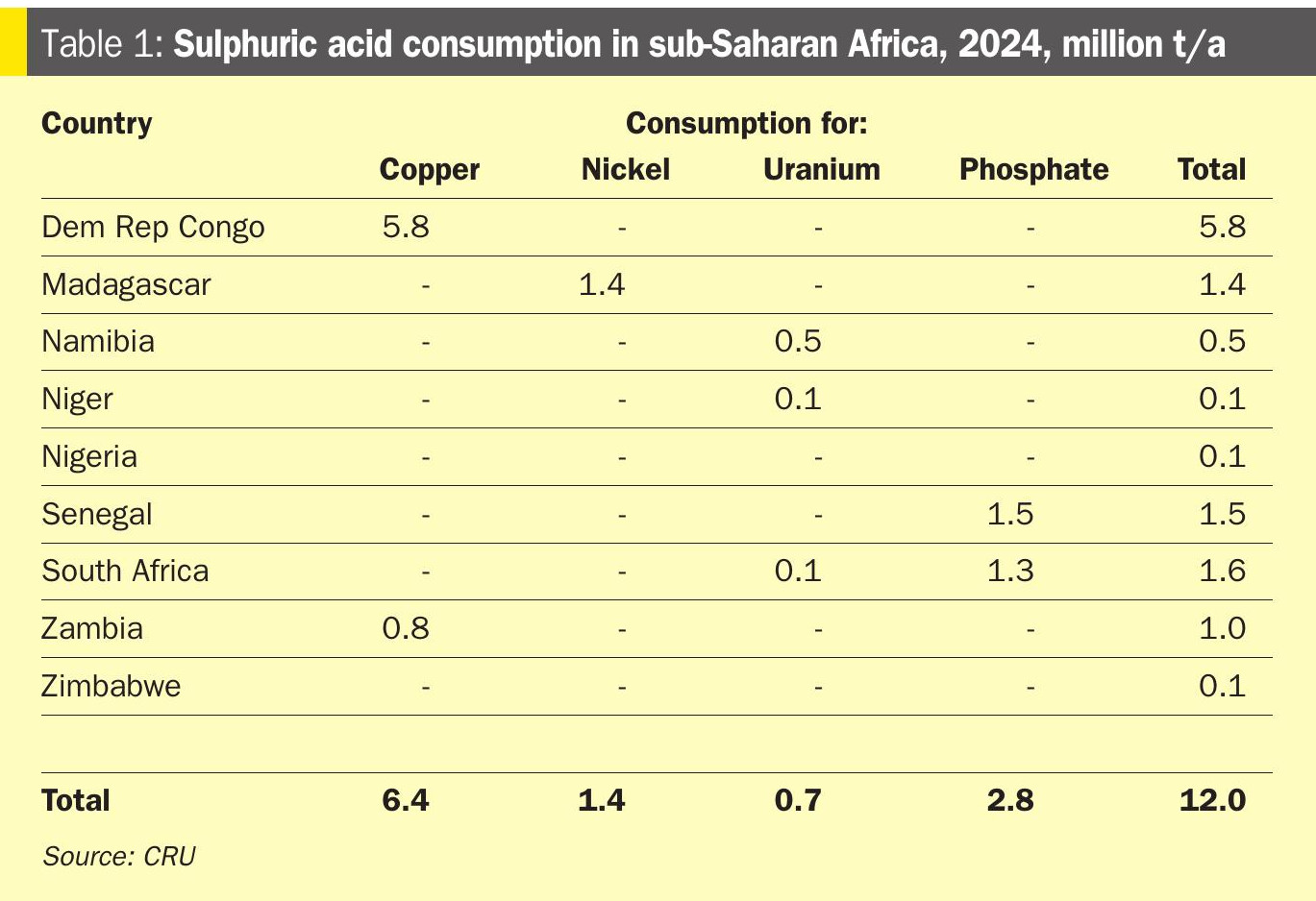 Other major operations in the country include Glencore’s Mutanda Mining (MUMI) and Kamoto Copper (KCC); CMOC’s Tenke Fungurume; ERG’s Comide and Frontier mines; China Molybdenum’s Tenke Fungurume Mine (TFM); and MMG’s Kinsevere mine. High copper grades have been amenable to leaching via solvent extraction/electrowinning (SX/EW), with consequent higher consumption of sulphuric acid. As Table 1 shows, the DRC’s copper industry consumed nearly 6 million tonnes of acid in 2024, almost half of the region’s total demand.
