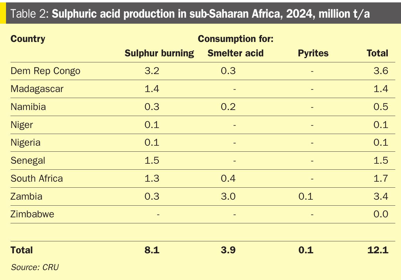 While north Africa’s sulphur demand is dominated by its phosphate industry, south of the Sahara it is copper, cobalt and uranium mining, leaching and smelting that hold sway over acid production and demand.