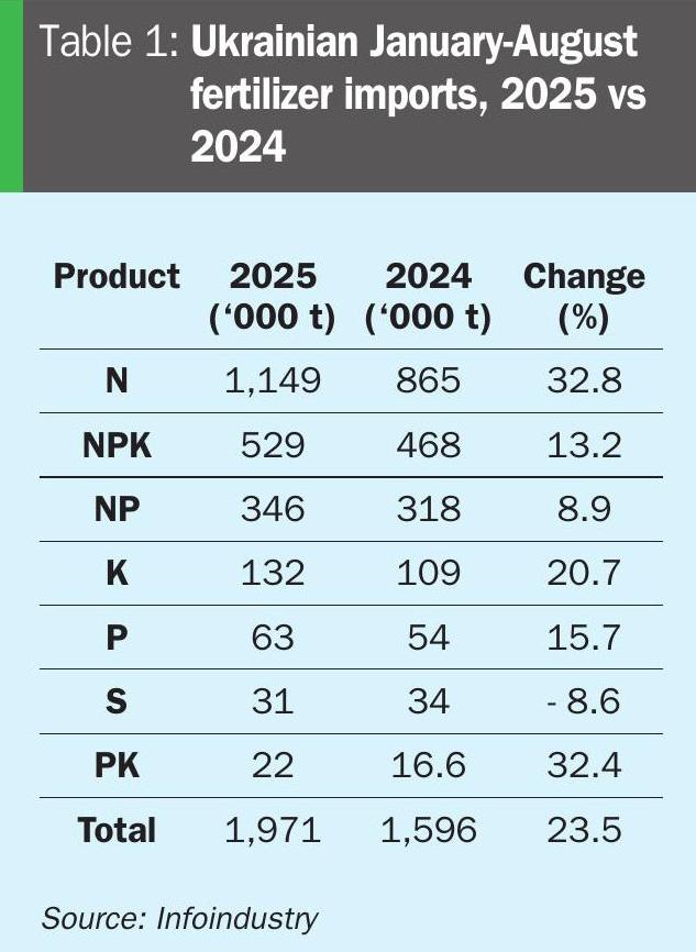 Ukraine’s fertilizer imports reportedly reached almost two million tonnes during January-August 2025 (1,971,000 tonnes) – an increase of around 24% y-o-y – with nitrogen fertilizers predominating and accounting for 1.149 million tonnes (58%) of total imports over this period (Table 1).