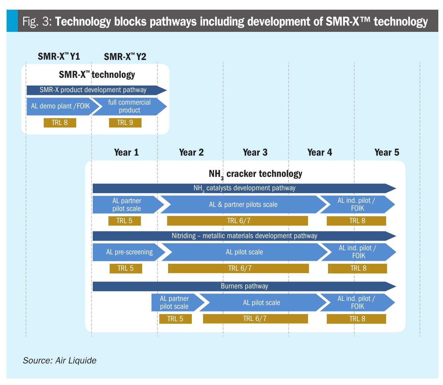 Innovation is at the core of Air Liquide4. In 2021, Air Liquide started its technology development based, among other things, on an assessment of the maturity of the technological blocks using the technology readiness level (TRL) scale5. It is essential to have access to reliable data. Fig. 3 describes the development strategy for the specific technological blocks of key interest. For each of them, development pathways have been defined to ensure that Air Liquide’s ammonia cracking process will reach TRL level 8 (system complete and qualified) in 2025.