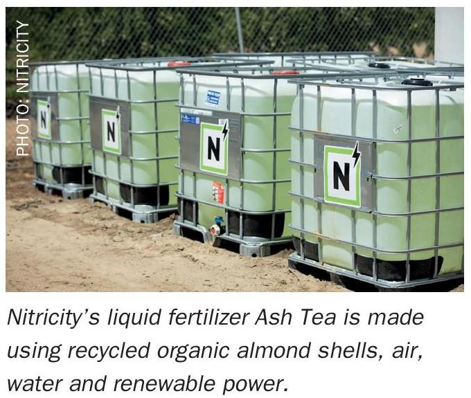 Nitricity manufactures a nitrogen liquid fertilizer – Ash Tea – from recycled organic almond shells, air, water and renewable power. This is being marketed as a low-carbon and organic alternative to traditional nitrogen-based synthetic fertilizers. Crop trials with Ash Tea have shown yield increases of up to 30% and noticeable improvements in early plant growth, the company reports.