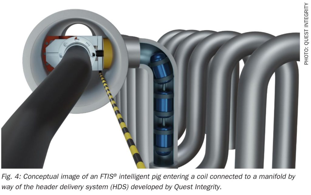 - Header delivery system: Where possible, a header delivery system can be used to launch and receive the mechanical cleaning pig and intelligent pig. This patented solution, developed by Quest Integrity, is achieved by removing one flanged end of the manifold or header or by cutting one end cap, before inserting the delivery system (Fig. 4).