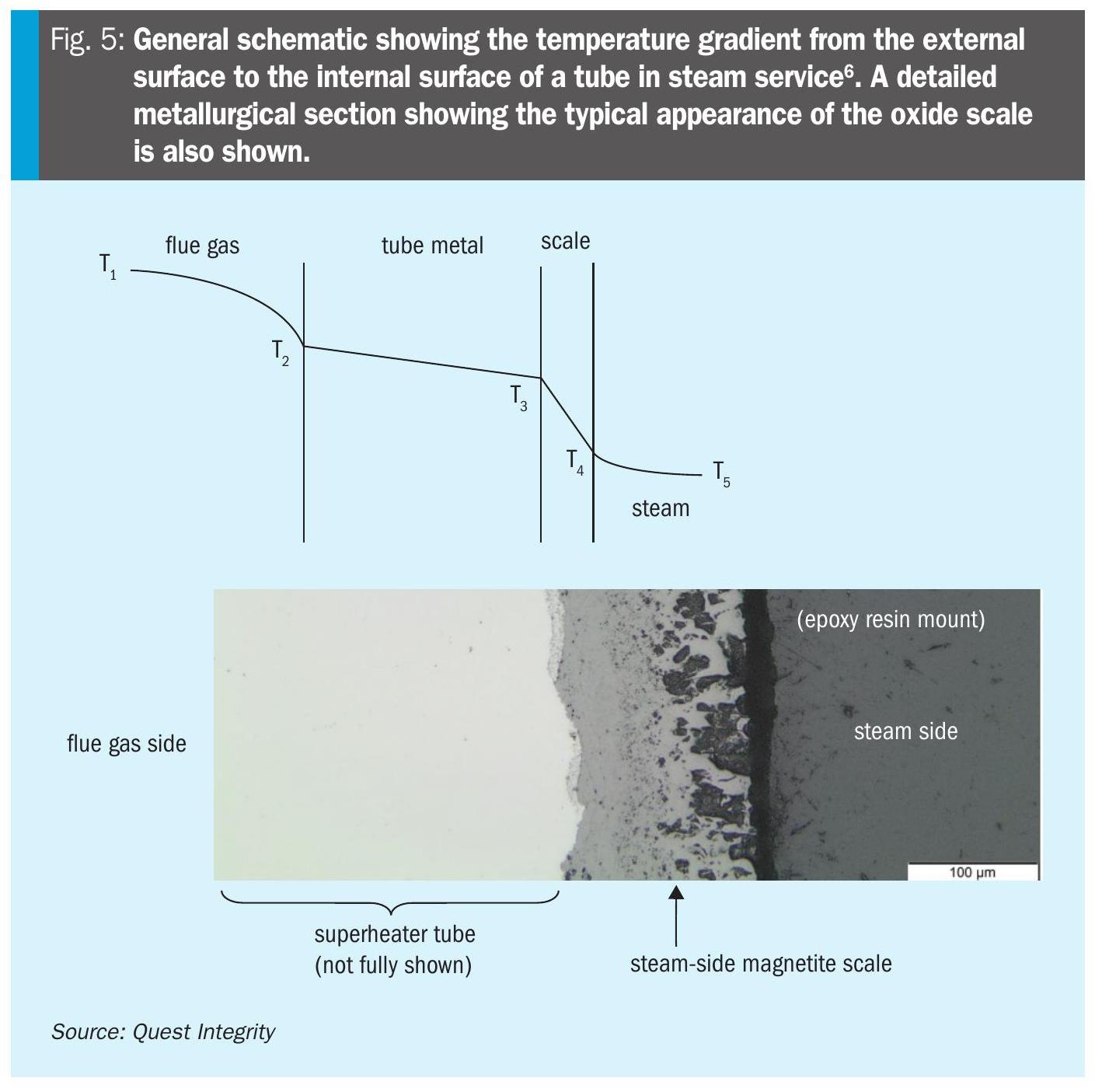 For coils and tubes operating in steam service, the oxide thickness-based life assessment can be used as an alternative approach to API 579-1/ASME FFS-1. This methodology utilises correlations developed by the Central Electricity Generating Board (CEGB) in the UK and the Electric Power Research Institute (EPRI) in the US to describe the oxidation kinetics for low alloy ferritic steels and some CSEF steels (namely 9Cr1Mo and 9Cr1MoV steels)3,4,5. The thickness of the steam-side magnetite scale provides an estimate of the tube metal temperature (Fig. 5), which is then used as an input for a creep remaining life assessment. This methodology has been widely adopted by power generation operators for managing the integrity of boiler and heat recovery steam generator (HRSG) tubes in subcritical and supercritical fossil-fuelled power plant and planning for tube replacements. This approach could also be adopted for assessing the creep remaining life of convection section coils and tubes operating in steam service, assuming that any heat flux, steam-side oxide thickness, wall thickness and material properties are known. If access permits, the steam-side oxide thickness and metal wall thickness could be obtained using ultrasonic methods. Alternatively, this information could be obtained by destructive laboratory examination, with any materials testing undertaken to provide the actual material properties for the creep life assessment.