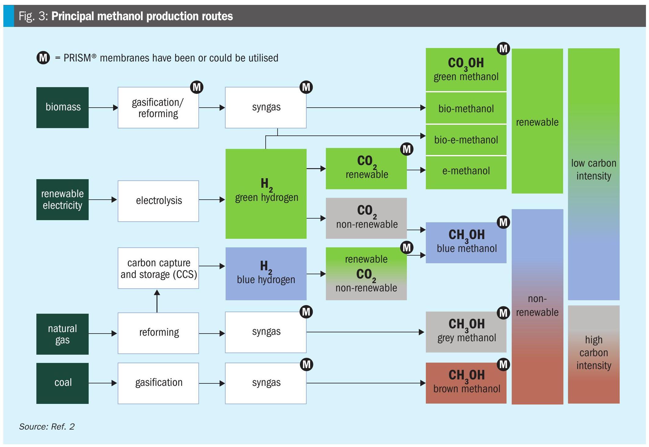 Methanol can be produced through various routes (Fig. 3), ranging from traditional coal and natural gas feedstock-based methanol (brown and grey) to biomass and renewable-based methanol (blue and green). Each pathway offers different benefits in terms of carbon footprint, feedstock flexibility, and regulatory compliance. Fig. 3 shows where PRISM® membranes have been or could be utilised to improve the efficiency of each process step.