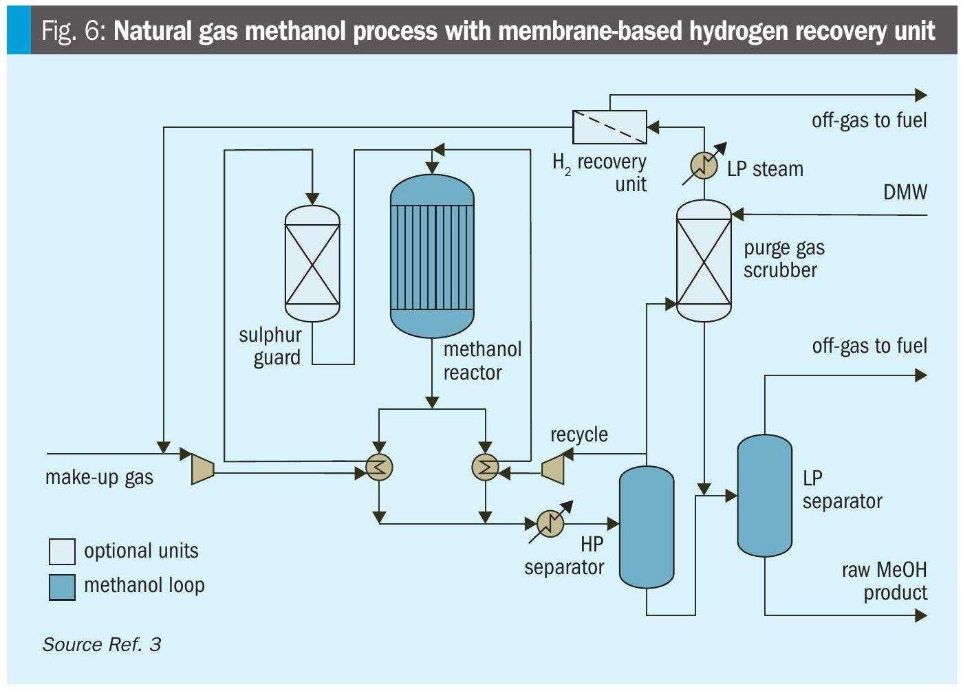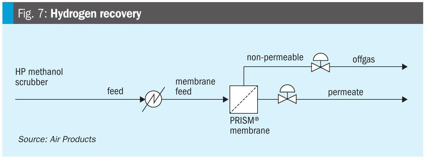 A PRISM® membrane purge gas recovery unit improves methanol plant efficiency by integrating into the synthesis loop (Fig. 6). In the process, a portion of the synthesis gas is purged to prevent the accumulation of inert components such as argon, methane, and nitrogen. This purge gas also contains valuable hydrogen and carbon monoxide. The gas is heated and fed into membrane modules at high pressure, where hydrogen permeates through the membrane and is returned to the synthesis compressor suction at a lower pressure. The remaining gases, including argon, methane, nitrogen, and carbon monoxide, stay on the non-permeate side and can be used as fuel in the reforming section. These systems recover typically 85-95% of the hydrogen from the purge gas, significantly increasing methanol production without increasing natural gas feed to the reformer.