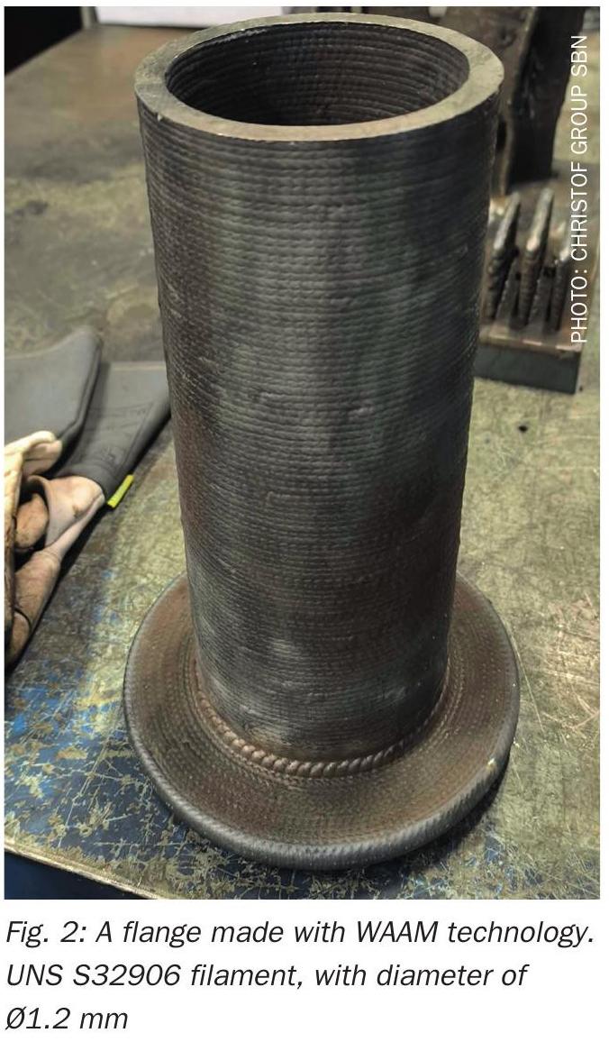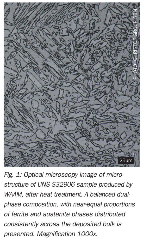Over the past few years, Christof Group SBN has invested in a series of focused R&D initiatives to optimise the mechanical performance and corrosion resistance of various materials, including SDSS, with the aim to better understand how the microstructure evolves during AM processing. In particular, WAAM technology was of interest, as it is the AM process that combines continuous metal feeding in the form of wire and arc-assisted deposition technique, to create large and near net shape, complex 3D structures. WAAM offers several advantages vs. alternative AM technologies like laser-assisted powder sintering routes, by offering comparatively lower welding equipment’s cost, easily available feedstock in the form of standard commercial metal wires and a higher deposition-rates. Compared with established steel manufacturing practices, WAAM offers significantly higher productivity, with deposition rates of up to 5 to 10 kg/h. An additional advantage of WAAM is that the maximum printable size depends primarily on the range of the welding robot used. The maximum printable dimensions of up to several metres can be increased by using robot tracks and welding manipulators. The combination of WAAM and subsequent milling enables the production of relatively complex shapes. This also means that topological optimisation and the production of generatively designed parts become more accessible. Compared to other direct energy deposition (DED) systems, such as direct metal laser sintering or additive electron beam manufacturing, WAAM offers relatively lower costs, due to reduced material wastes. Another peculiarity of the WAAM is the possibility to design functionally graded components where multiple materials can be combined to design a single component. Used materials are only deposited in agreement of target shape. This is especially important for workpieces that are traditionally milled from solid blocks and/or workpieces that are made from expensive materials.