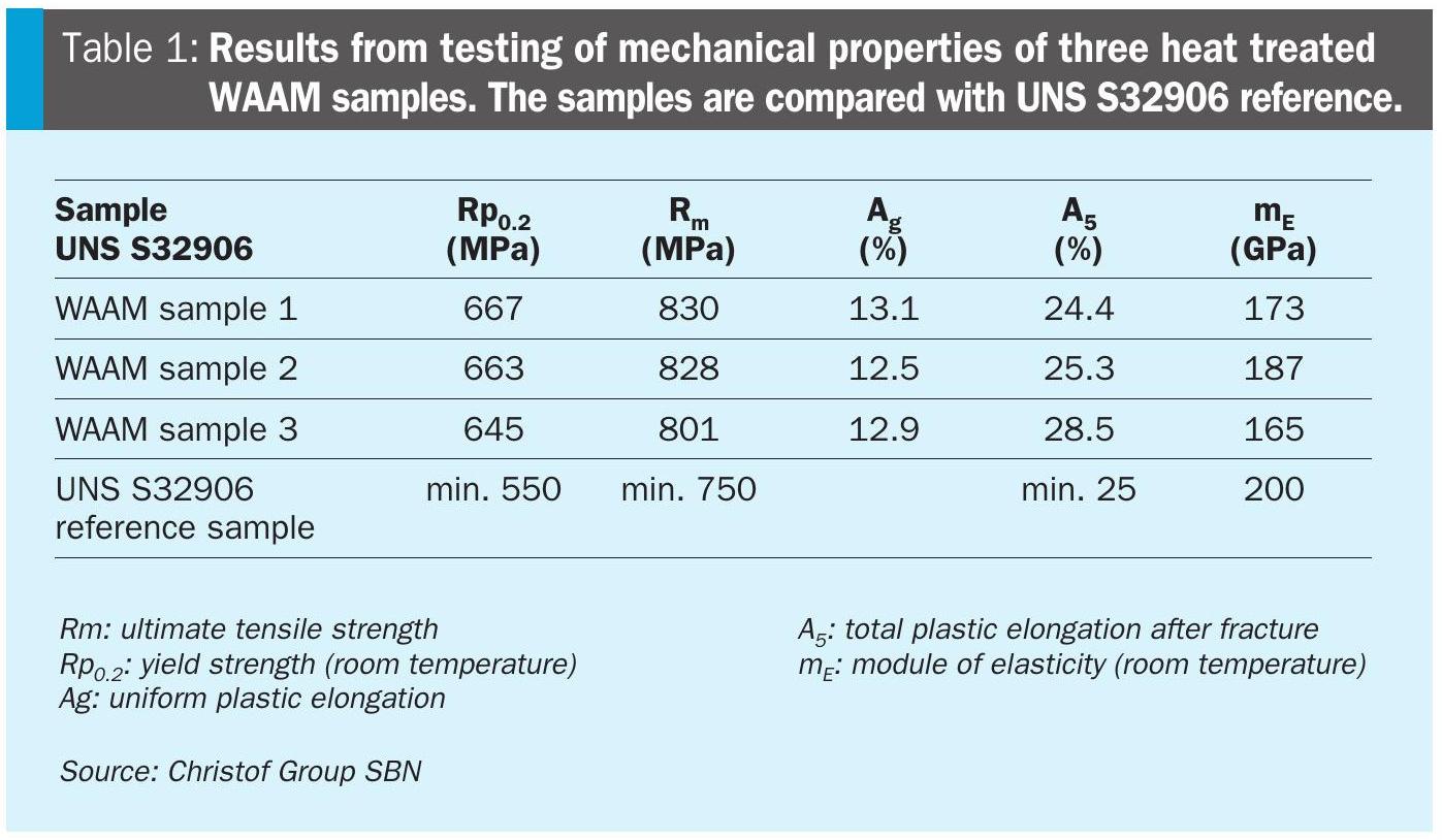 Mechanical testing, including assessments of yield strength, elongation and ultimate tensile strength in both, the build and travel directions, confirmed that controlled WAAM delivers samples that match the performance of their wrought counterparts (see Table 1). This indicates that the WAAM process preserves the inherent mechanical advantages of UNS 32906.