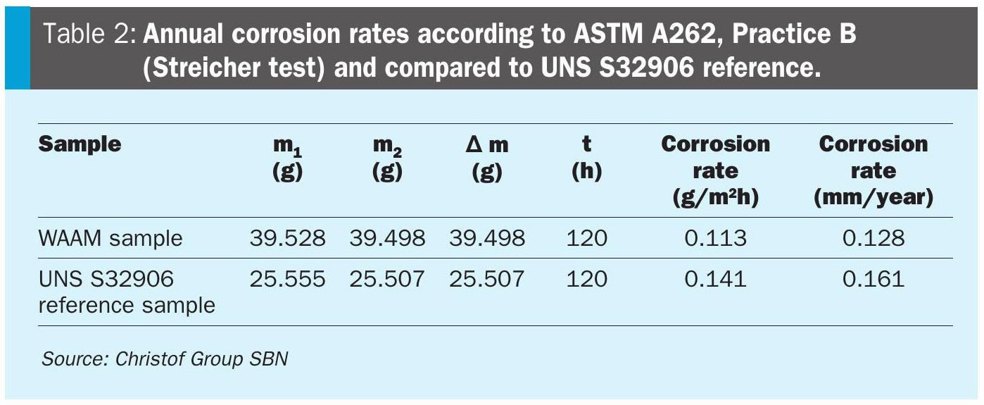 To evaluate corrosion performance, the samples are subjected to testing according to ASTM A262, Practice B. The results of the Streicher test reveal an annual corrosion rate of the WAAM sample that is significantly lower than the threshold of 0.6 g/m2 h, according to the applicable customer specification. Interestingly, the annual corrosion rate of the WAAM sample is considerably lower in comparison to the annual corrosion rate of the commercially available UNS S32906 reference sample material (Table 2).