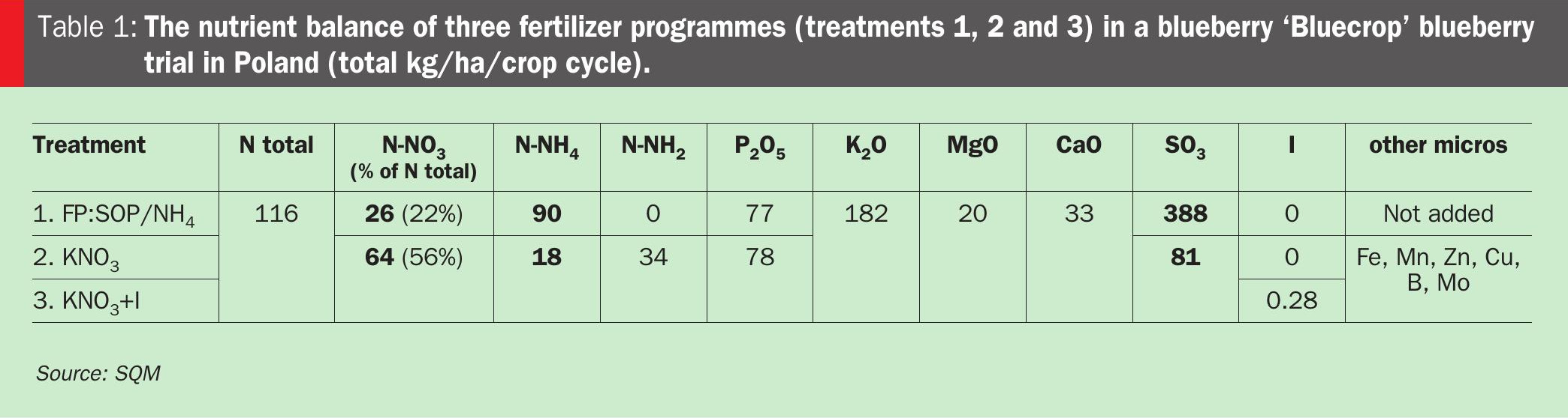 An on-farm trial was carried out in Mexico on blueberries (var. Biloxi) grown in a cocoa-chip substrate. The addition of iodine to the nutrient solution (9.5 Meq./L NO3– vs 4 Meq./L NH4+) resulted in 1 degree C Brix increase (from 6.1 to 7.1) and extra fruit calcium (1.2 mg/100 g) in the tunnels, where this was applied with potassium nitrate (SQM Ultrasol® ine).