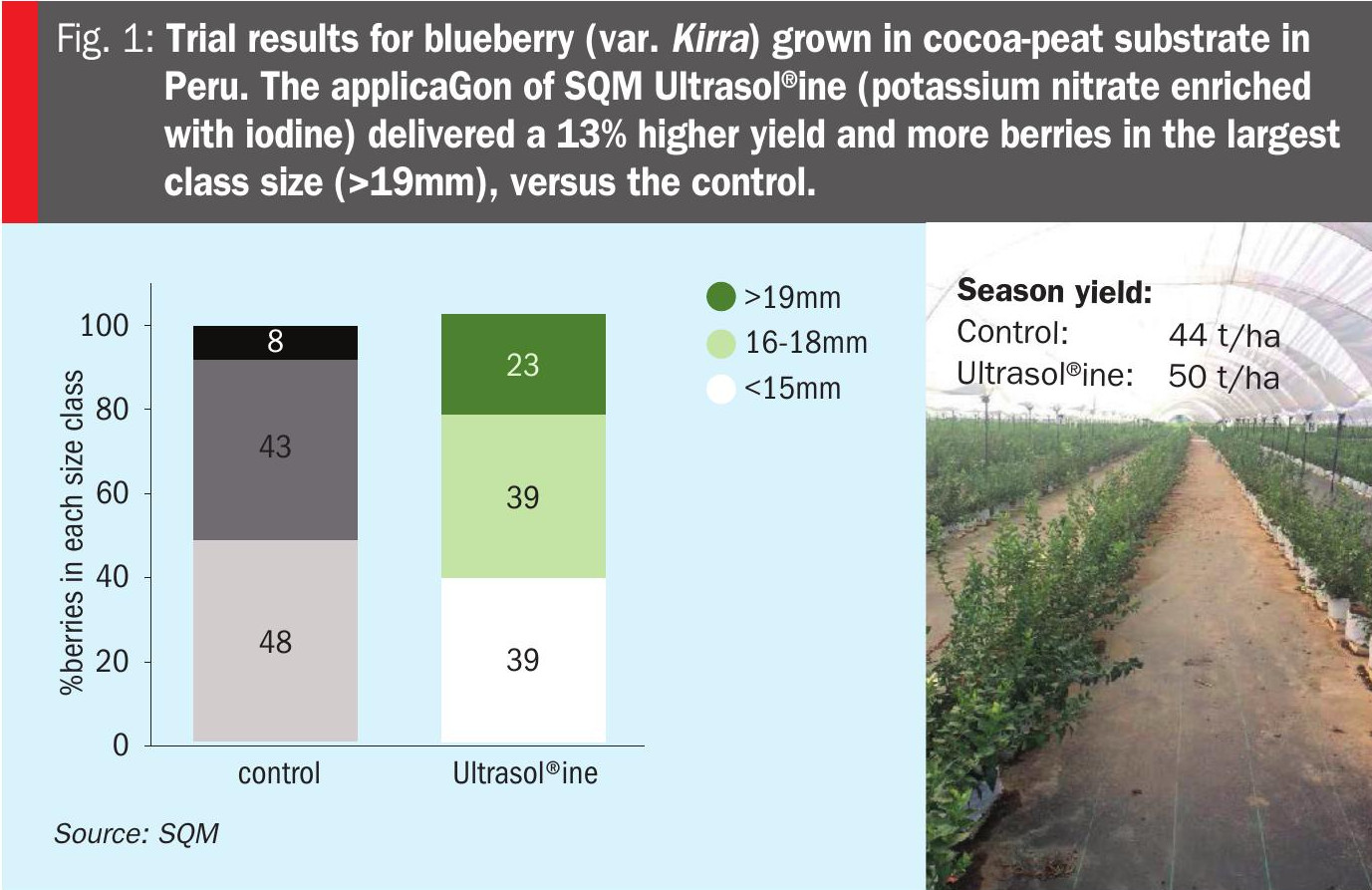 Highly positive results were also recorded in a trial on blueberry (var. Kirra) grown in cocoa-peat substrate in Peru. The use of iodine with potassium nitrate (SQM Ultrasol® ine) in a nutrient solution delivered a 13% yield increase, as well as bigger berries with more in the largest >19 mm size class (Figure 1).
