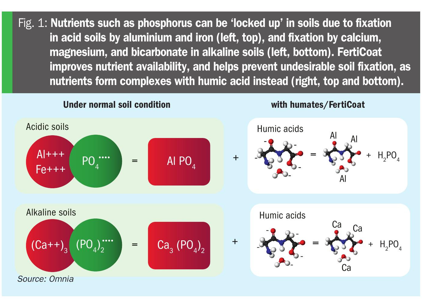 Agronomically, it acts to improve both nutrient retention and soil fixation. In sandy soils, the humic acid present in FertiCoat helps prevent the loss of water-soluble nutrients to leaching by providing a charged surface able to retain these. FertiCoat also complexes with nutrients, particularly phosphorous, to prevent these becoming fixed or ‘locked up’ in soils. In acidic (low pH) soils, for example, it acts to stop phosphorus fixation by aluminium and iron. Similarly, it helps avoid fixation by calcium, magnesium, and bicarbonate in alkaline (high pH) soils (Figure 1).