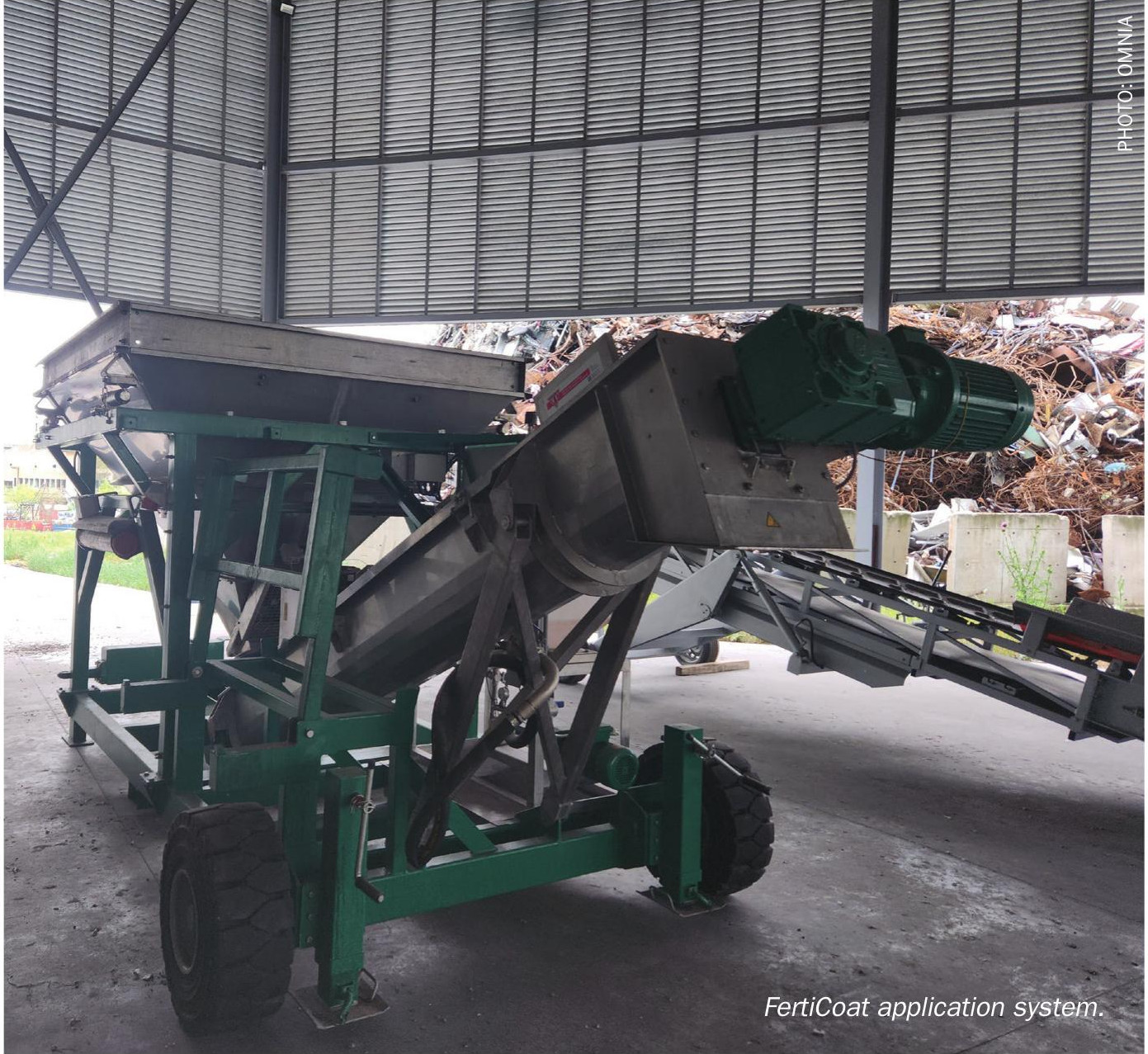 FertiCoat can be applied to fertilizer granules using various equipment, such as granulation drums, coolers, coating drums, blenders, screw augers, or conveyors. Omnia also offers a dedicated FertiCoat applicator system with a controller, pump and double spray jets for good coating coverage (see photos).