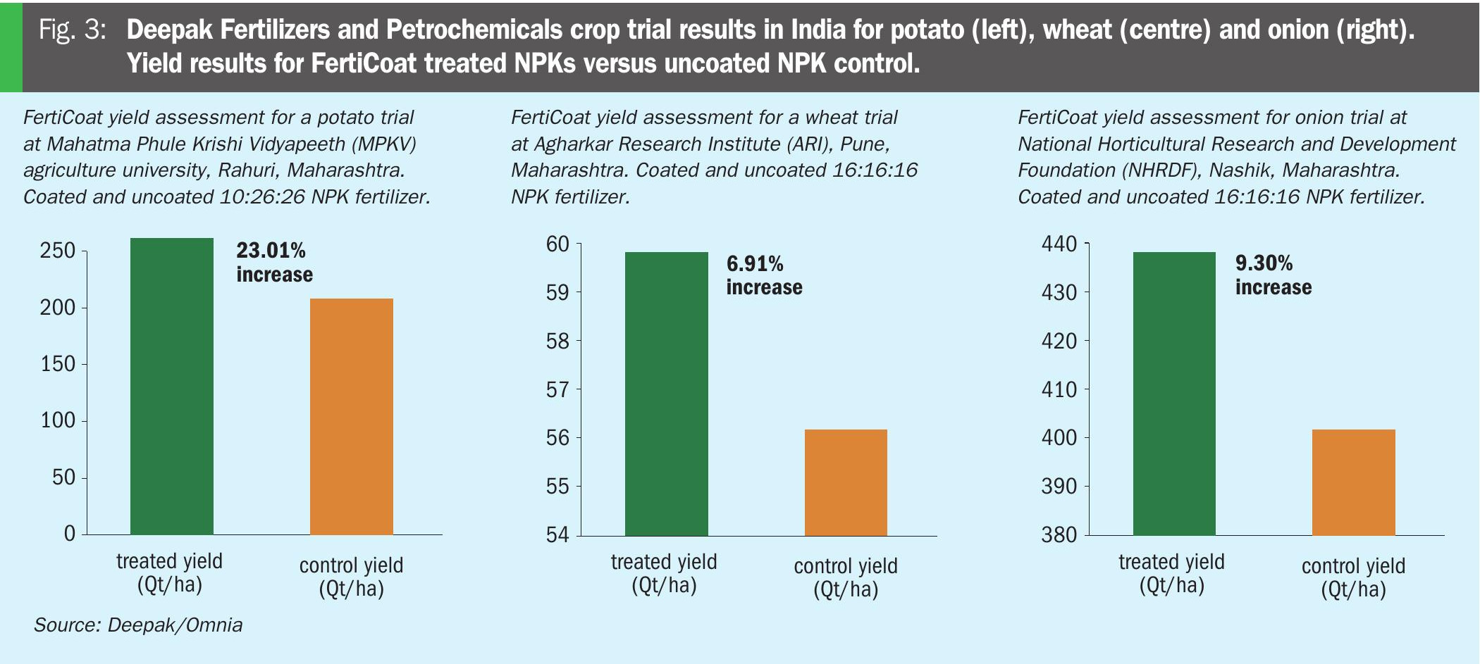 Elsewhere, leading Indian fertilizer manufacturer Deepak Fertilizers and Petrochemicals Corporation Limited (DFPCL) has been producing NPK fertilizers coated with FertiCoat, after extensive agronomic trials showed significantly higher yields across a range of crops. These included yield improvements for potato, wheat and onion of around 23%, 7% and 9%, respectively, with FertiCoat treated NPKs, relative to the untreated control (Figure 3, left to right).