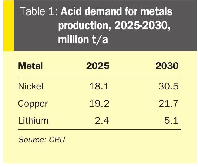 Increased demand for battery metals is leading to a major boost to sulphuric acid demand, as shown in Table 1. This year, it is expected that metals-based demand growth will actually exceed phosphate based demand growth for the first time, and over the next few years they will be roughly on par. The energy transition cannot happen without sulphuric acid. From lithium clays in Nevada to nickel laterites in Indonesia, from NMC cathodes in China to copper foil in every battery on Earth, acid is the invisible enabler, and we are looking towards a future where metals demand may rival fertilizers. The question is no longer whether battery metals will drive acid demand – it is whether the world can build enough capacity, fast enough, to keep pace.