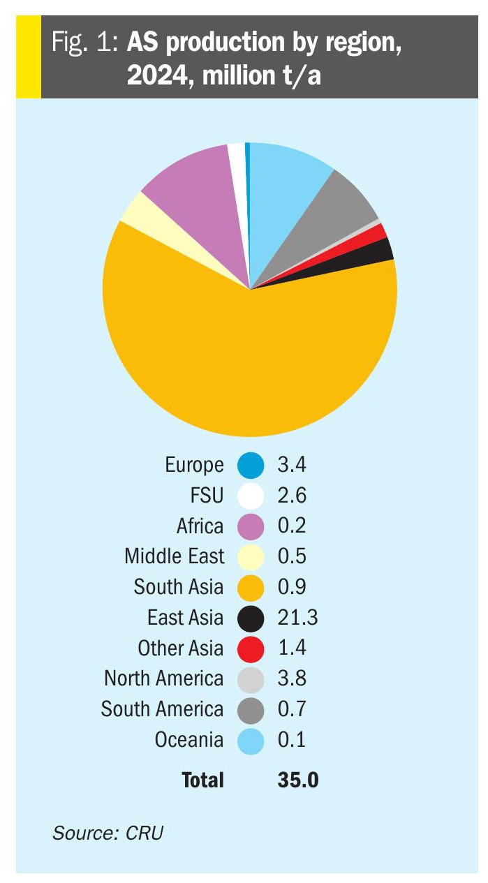 Ammonium sulphate is still the largest sulphur fertilizer by volume. Global ammonium sulphate production was 35.0 million t/a in 2024, with the 2025 figure expected to reach 35.8 million t/a. Figure 1 shows the geographical distribution of capacity. As can be seen, most is in East Asia, and 95% of that figure is represented by China, where there is a great deal of involuntary production as a by-product of caprolactam manufacture for nylon fibres, methylmethacrylate (MMA), acrylonitrile, methionine production etc.