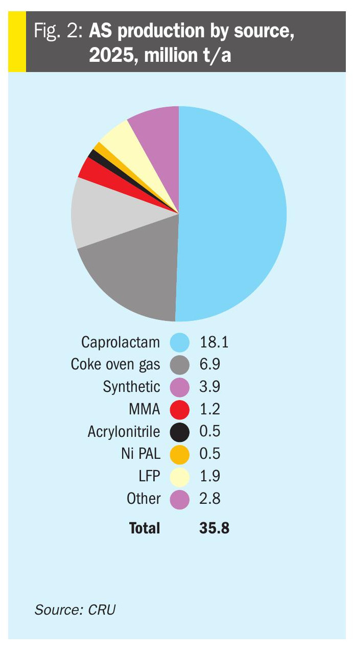 Byproduct routes drive most of the growth. Caprolactam-derived AS and LFP-related production account for the majority of incremental capacity additions over the period 2024–2026. Voluntary, ammonia-based routes picked up in regions such as Russia, where new projects and restarts increased granular and synthetic capacity through 2025.