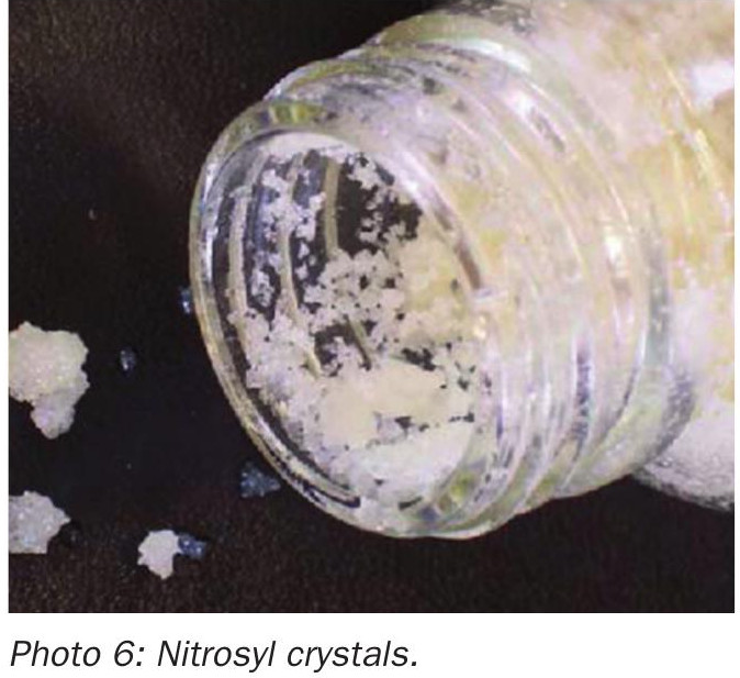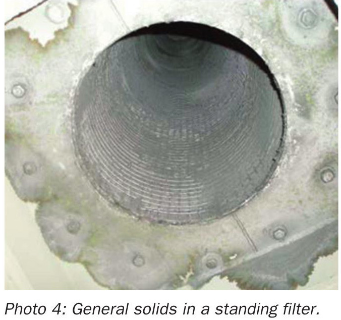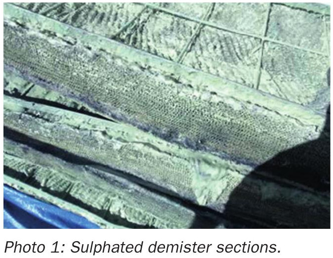 When inspecting the mesh pad in the tower from above you may be able to see evidence of sulphates (see Photo 1). However, it should already be expected if the recorded pressure loss trend showed a gradual or rapid rise of 30% or more. The demister would need to be cleaned or replaced.