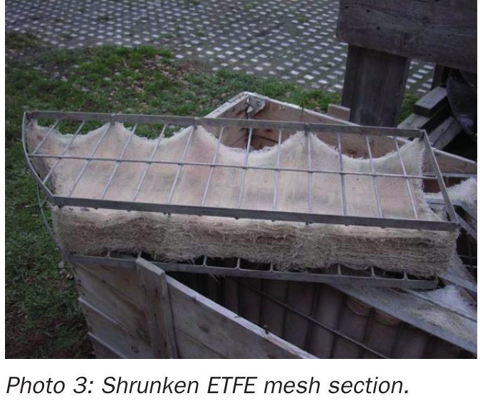 Corrosion of metal wire mesh (or even support grids) can be identified during an inspection and may be anticipated if acid drainage downstream increases. Corrosion may sometimes be localised, rather than general, and may point to a problem lower down in the tower. Depending on operating conditions, required campaign length etc. the choice usually lies between 316L stainless steel, Alloy 20, high silicon alloys (e.g. Saramet 35 or SX) or ETFE fluoropolymer. The latter does not corrode but is heat sensitive and eventually shrinks above 80˚C and does not usually last longer than three to four years (see Photo 3). Alternative arrangements, such as ‘brickwork’ ETFE mesh pad sections can help.