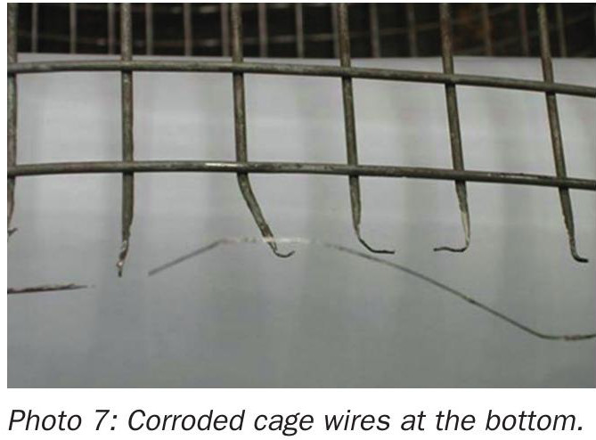 Corrosion of mist eliminator structures is initially found at the bottom of the structure, where a small amount of acid remains undrained from the fibre and which gets diluted by humidity, for example. The cage wires being the thinnest material involved are then corroded and, if they are welded to a flange or plate, the structure’s integrity will begin to fail (see photo 7).