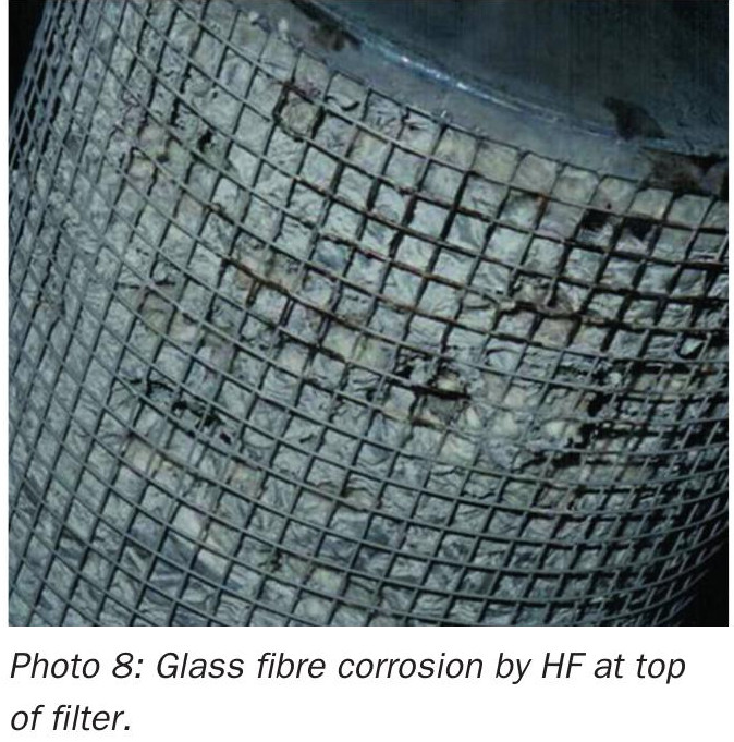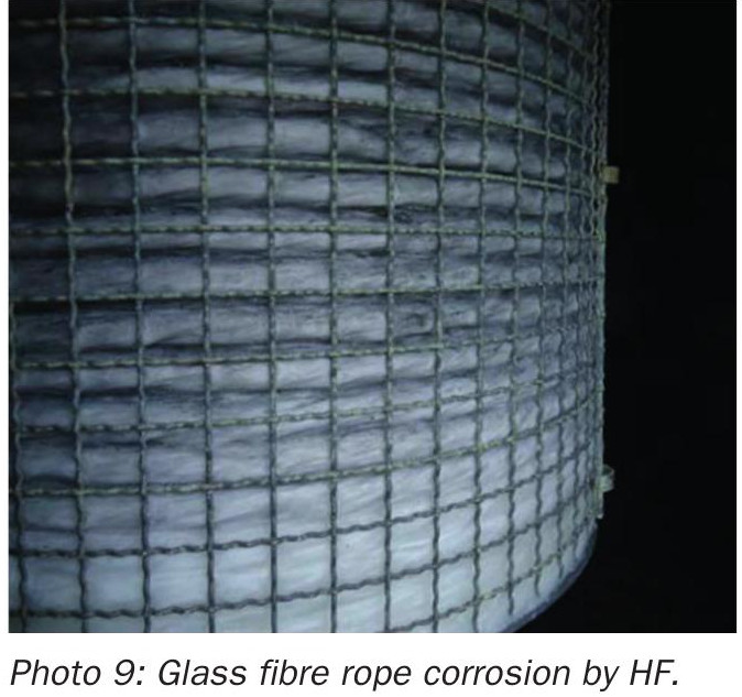 When there is fluorine present in the gas, this will form HF which corrodes glass fibre, randomly and initially visible near the top of a mist eliminator (see photos 8 and 9). As the glass fibre bed thins and develops holes, there can be a noticeable decrease in pressure loss and a loss of efficiency seen on stick tests.