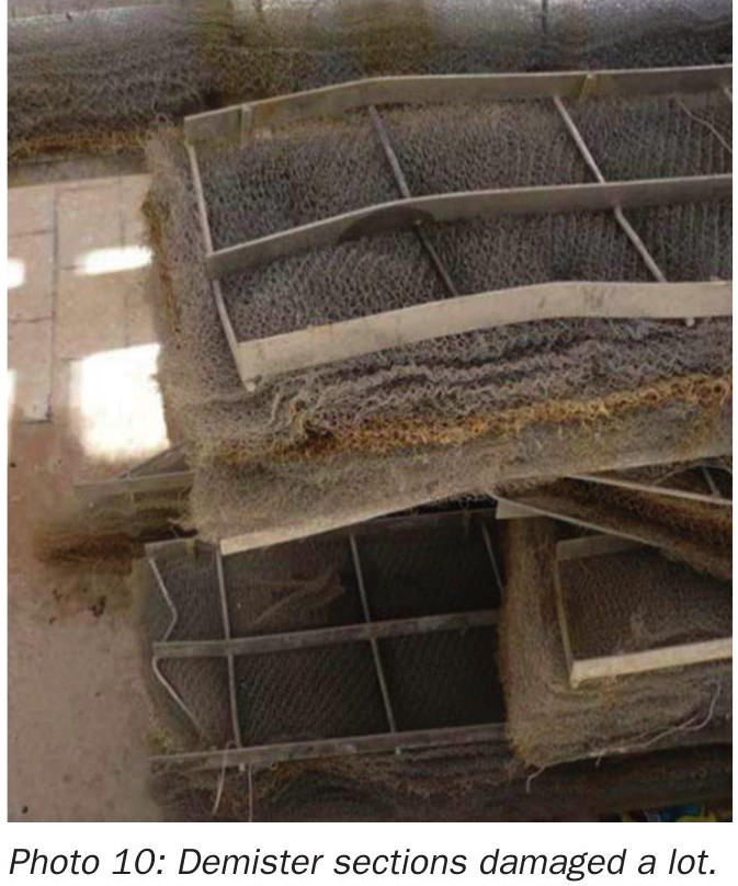 Care should be taken when the demister sections are removed from and re-installed into the tower. As previously mentioned in the comments on a demister’s compression fit, the workers should expect a degree of resistance when removing the central sections. Damage done at this point can compromise the demister when the sections are re-installed. Bending of support grids and crushing of the mesh pad’s sides can be hard to repair but would lead to gas by-pass if left untouched (see photo 10).