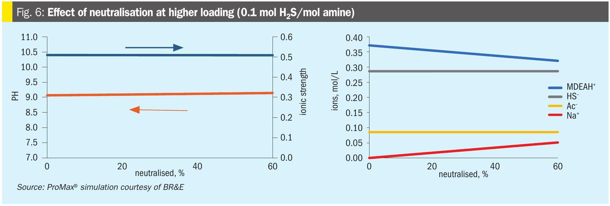 An unexpected finding from the ProMax® study is that ionic strength does not change appreciably due to neutralisation, and therefore other properties that depend on ionic strength (electrical conductivity, activity of ions, etc.) should not be expected to change very much either. This makes sense upon reflection: As shown in Fig. 5, the net effect of adding NaOH is to convert MDEAH+ into Na+ , i.e., it changes one cation for another cation in a 1:1 swap without any net increase to the number of charged ions in solution. This simulation result is at odds with observations made in Reference 2 where adding NaOH to an HSS-laded amine solution resulted in higher conductivity in the lab. At this time, no explanation for this difference is offered – it could be an area for further investigation.