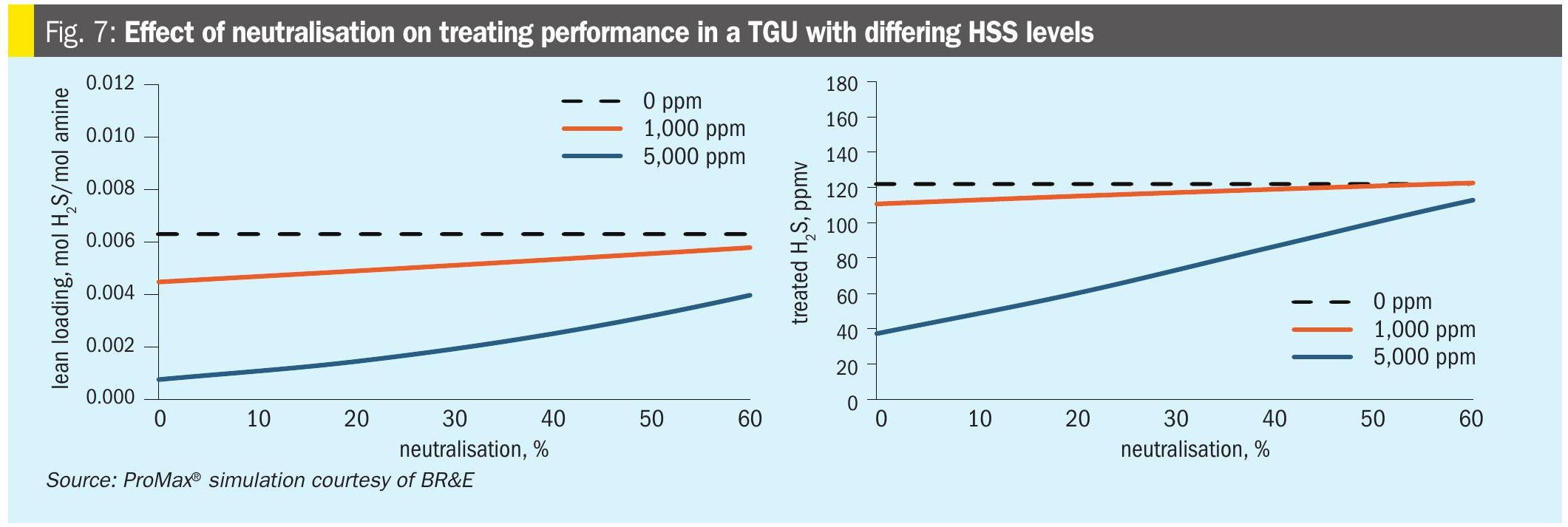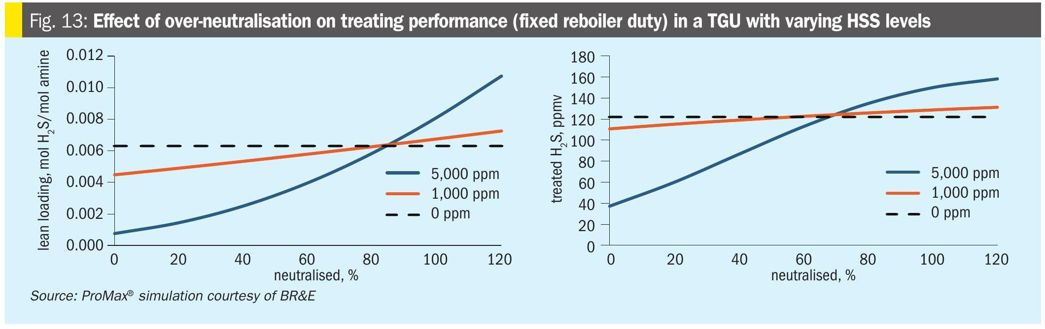 Fig. 13 shows the simulated impact of over-neutralisation on lean loading and treated gas H2S in a typical TGU. At roughly 85% neutralisation, the lean loading has returned to the level for the case without HSS. Above this point, continued neutralisation leads to further increases in lean loading and H2S in treated gas.