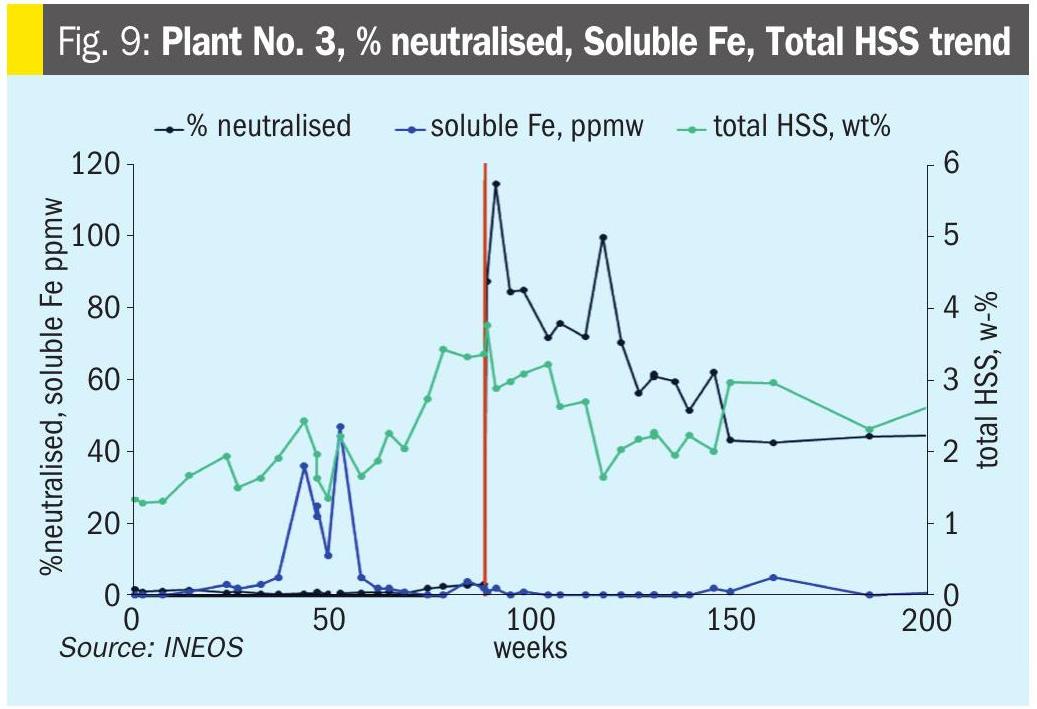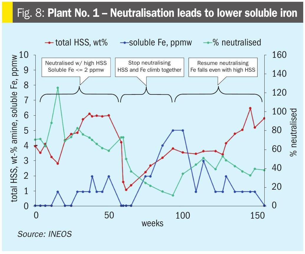 Plant No.1 – Neutralisation leads to lower soluble iron Data shown in Fig. 8 demonstrates a correlation between % neutralisation and soluble iron. Even when Total HSS are high, there is low soluble iron when neutralised. In this unit, HSS are predominantly formate and thiocyanate, which is typical for refinery service.