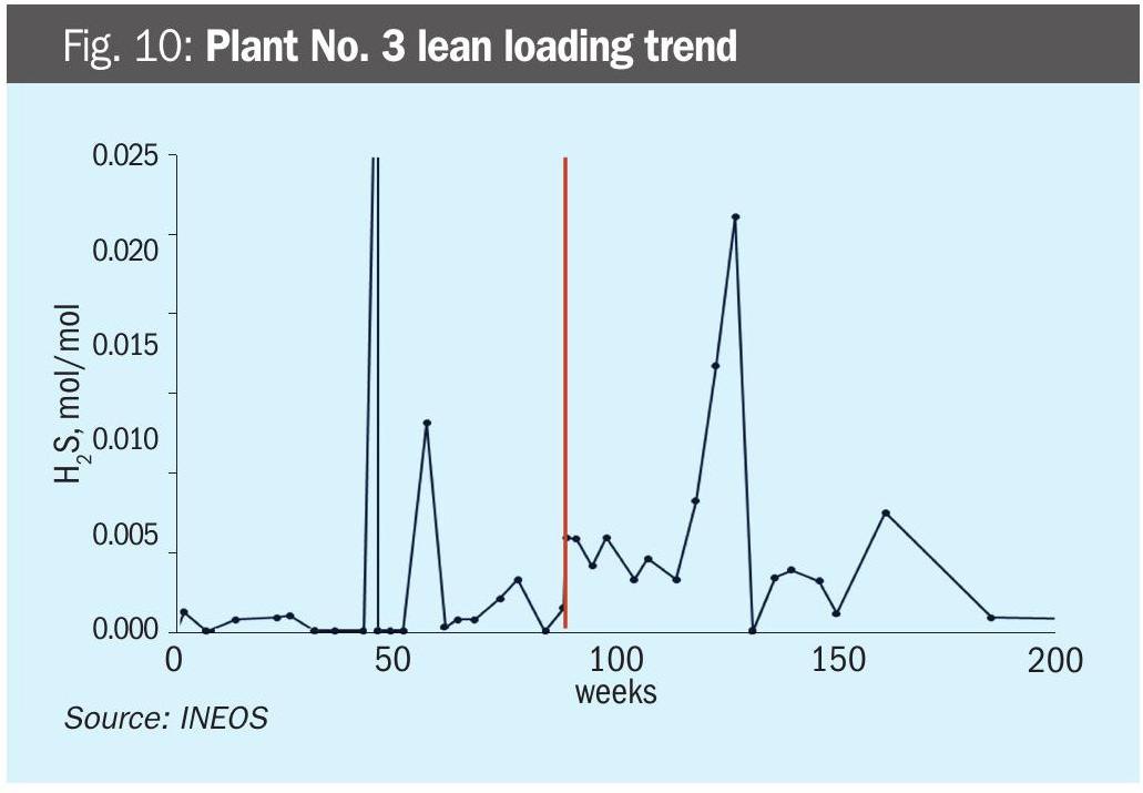 Plant No. 3 – Neutralisation leads to less corrosion and longer filter life (anecdotal) In this H2S and CO2 system, the plant reported experiencing corrosion failures and frequent filter changes. They added NaOH to reach 7,000 ppmw Na+ and 100% neutralised (Fig. 9). The plant reported fewer corrosion issues and longer filter life. There was a noticeable increase in lean loading (Fig. 10), but soluble metals did not have a clear response (Fig. 9).