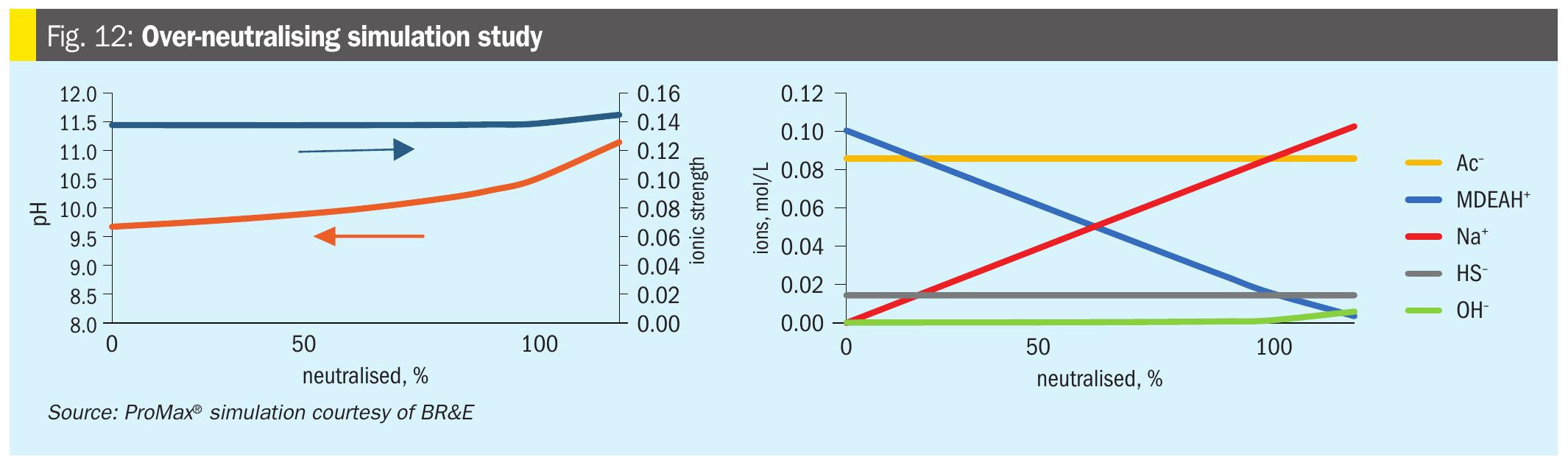 A ProMax® simulation study was used to investigate what happens to ionic speciation when NaOH is added to an amine solution with HSS. The example uses a 34 wt-% MDEA solution with acetate as a contaminant. To simplify the process, only H2S is considered as an acid gas.