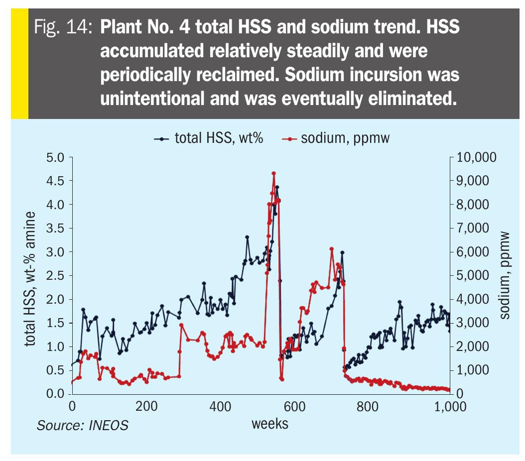 During the first time period, Total HSS are high at 3 to 6 wt-%, the amine is 60 to 80% neutralised, and soluble iron is low at ≤ 2 ppmw. At the end of this time period, the amine was reclaimed, which resulted in lower HSS and soluble iron.