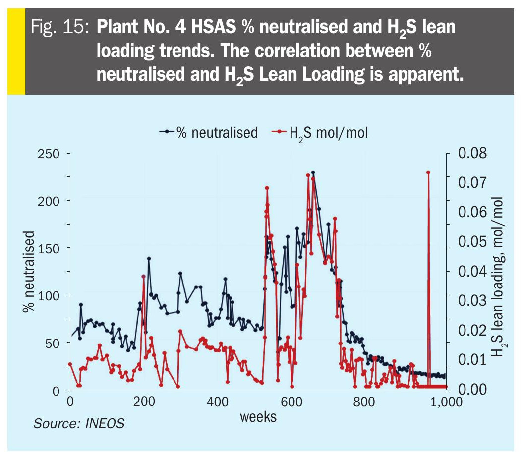 Plant No. 4 – Over-neutralisation leads to higher lean loadings This refinery ARU had unintentional Na+ and K+ incursion (Fig. 14) leading to > 100% neutralised solvent. The issue was eventually resolved.
