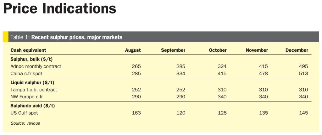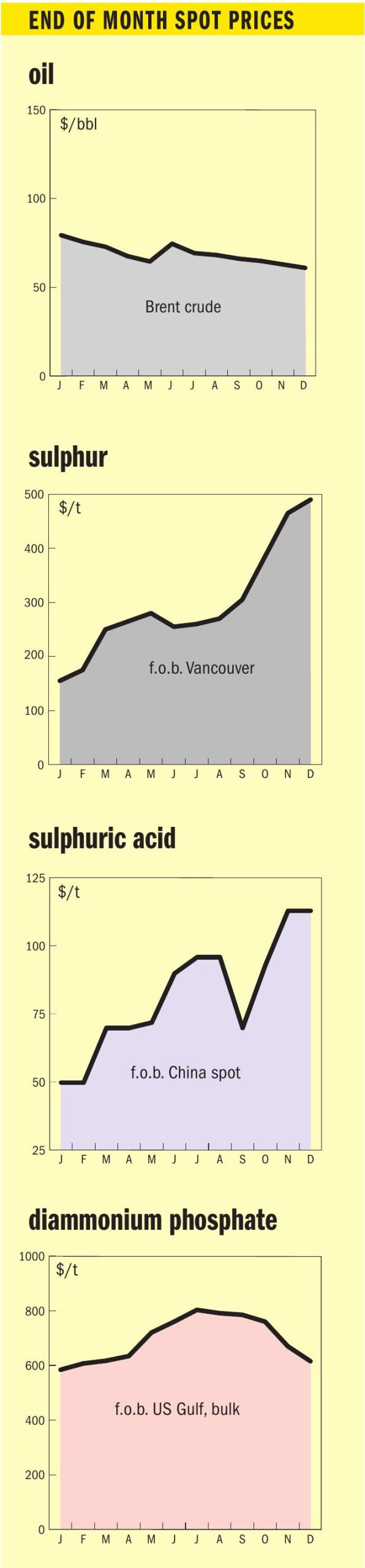 Vancouver prices ended 2025 at a multi-year high of $485-495/t f.o.b., supported by firm netbacks from Brazil as Chinese demand remains limited. This price surpasses the 2022 peak but is still well below the 2008 record. Negotiations for quarterly liquid sulphur contracts in Tampa for Q1 2026 were not yet concluded at time of writing. Broader market chatter has recently coalesced around $475–520/t f.o.b. Tampa for Q1, though no settlement has been reached. Downstream affordability has been a key focus given firmer sulphur values versus softer fertilizer pricing. DAP has retreated from earlier highs, increasing buyer sensitivity to feedstock costs and tightening margin headroom for phosphate producers.
