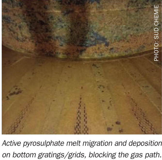- Incorrect chemical composition can cause active pyrosulphate melt migration and deposition on bottom gratings/ grids, blocking the gas path.