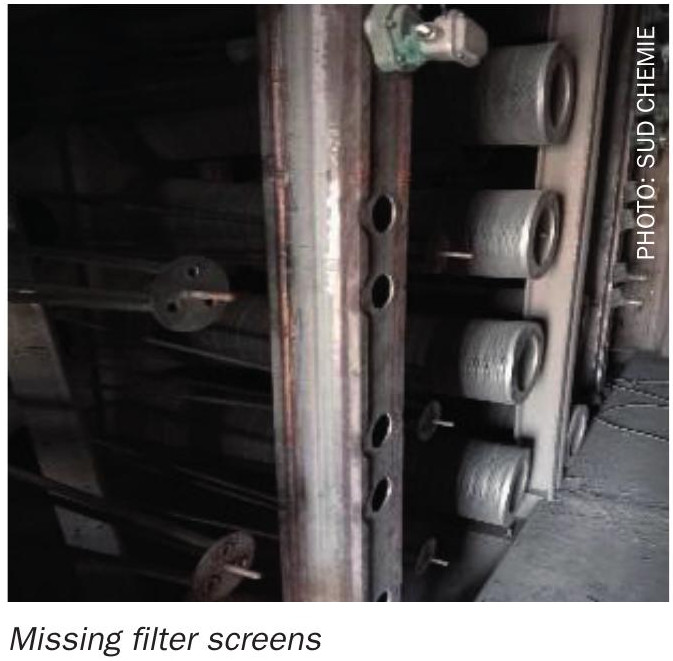 - plugging of the catalyst bed bottom grids or support screens;
