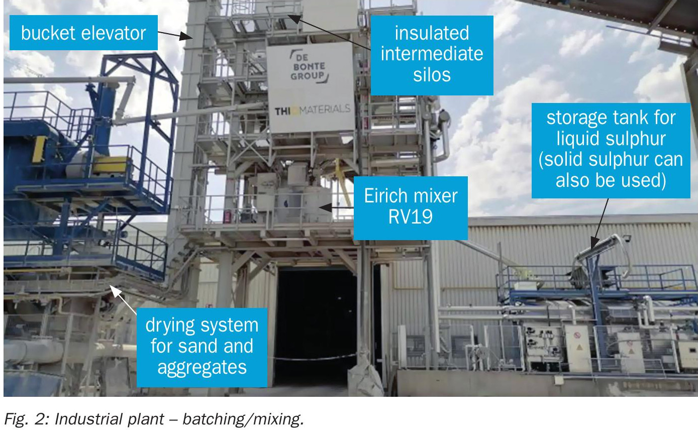 This short cycle accelerates production and reduces energy for curing. The Baudour (Belgium) factory operates at 10 t/h, producing up to 120,000 sleepers/year (Fig. 4) plus sulphur concrete pipes, using standard prestressing reinforcement and fastening inserts.