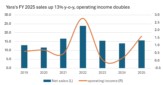 Yara International’s full-year earnings (EBITDA) surged in 2025, rising 46% year-on-year (y-o-y) to $2.75bn, while sales climbed 13% to $15.7bn and operating income more than doubled to $1.57bn. EBITDA excluding special items rose to $709mn in Q4 2025, up from from $519mn in Q4 2024, driven by stronger nitrogen margins, lower fixed costs and solid volumes.
