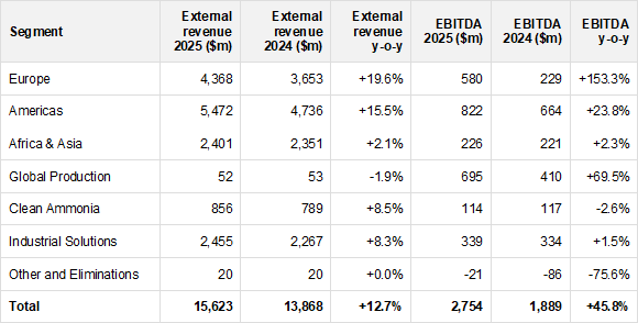 The earnings recovery was led regionally by Europe and the Americas, while Yara’s Global Production unit also posted a sharp y-o-y EBITDA increase. Commenting on the results, CEO Svein Tore Holsether said the 2025 earnings increase was “driven by higher nitrogen upgrading margins, lower fixed cost and strong volumes”, adding that Yara had “more than delivered” its savings plan.