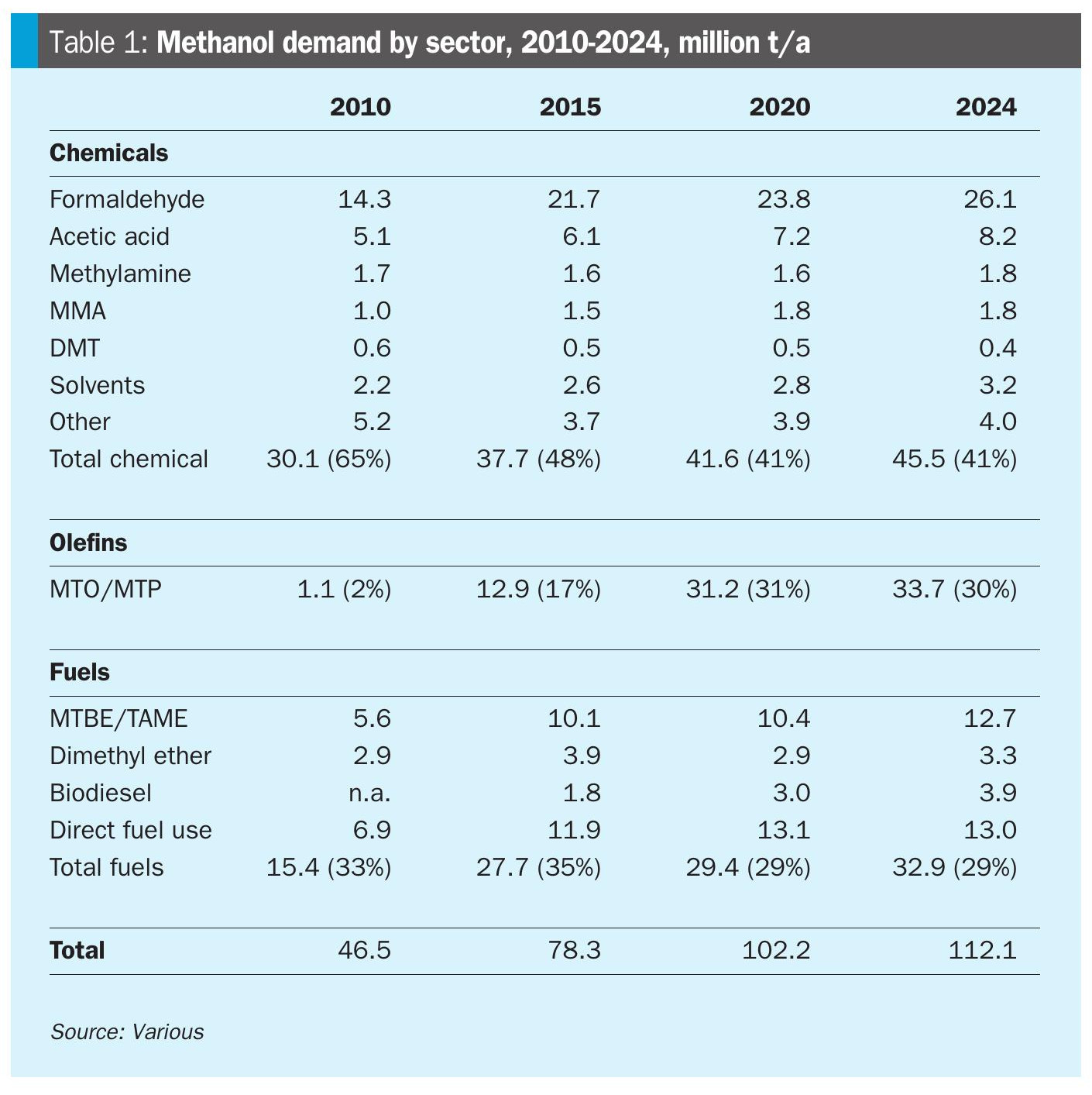 Methanol’s phenomenal growth in the early years of the century was based on its uptake into fuel uses and its ability to bridge coal reserves with plastics production in China. However, with these sectors maturing, traditional chemical end uses are becoming the main growth sector once again.