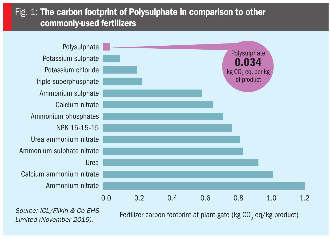 “Polysulphate has the lowest carbon footprint (0.034 kg CO2 e per kg of product) when compared to common fertilizer alternatives, according to the results of a new study (Figure 1). Its production footprint is less than three percent of that of ammonium nitrate, for example. Its low carbon footprint is making Polysulphate the fertilizer of choice for those farmers wishing to manage their carbon usage and lower greenhouse gas emissions.”