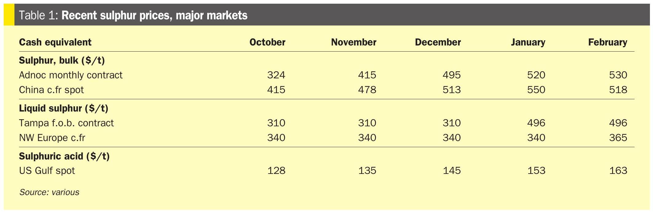 Reflecting the paralysis, producers either delayed or did not post their March sulphur selling prices. After an initial delay, QatarEnergy eventually announced its March price as a rollover at $520/t f.o.b. Market sources have since confirmed that ADNOC (UAE) has also settled its March price at a rollover from February at $530/t f.o.b. on 5 March. This counters earlier market expectations, which had pointed towards a downward correction for March before the conflict escalated. Of the major producers, only KPC (Kuwait) had yet to announce its price at the time of publication. Amid the standstill, only one spot transaction has been reported since the conflict escalated: a 20,000 tonne Bahrain-origin cargo, which was sold to China at $555/t c.fr, reflecting the extreme premium required to secure any volume from the region. As the latest freight rates from the Middle East to China are unclear, the range was unchanged.