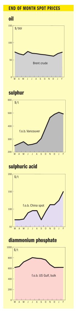 The reaction across major import markets has been varied. In China, the uncertainty prompted a sharp upward adjustment in domestic port pricing, reaching their highest levels since 2008; c.fr levels reached $550-560/t, up from $515-520/t. Domestically, the port spot price surged by $65/t from 27 February to a peak of $651/t on 4 March. Recent trades supporting these levels include 20,000 t of Bahrain-origin product sold at $555/t c.fr on the Changjiang river. The price surge is creating significant pressure on downstream phosphate producers. With sulphur now trading above domestic DAP and MAP prices, many are monitoring the situation closely rather than rushing to purchase. Large producers with existing inventories or access to cheaper domestic refinery sulphur are not under immediate pressure. In contrast, smaller MAP producers are facing potential production cutbacks due to poor affordability. Consequently, most port transactions are currently concentrated among traders. The geopolitical uncertainty has also weakened sentiment around China’s 2026 phosphate export outlook, further reducing producers’ buying interest. Total port inventories declined by 28,000 tonnes to 1.725 million tonnes by 5 March. The volume at Yangtze River ports saw the largest drop, decreasing by 24,000 tonnes to 702,000 tonnes, while Dafeng port’s inventory remained stable at 140,000 tonnes.