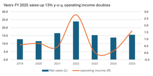 Yara’s full-year earnings (EBITDA) surged to $2.75bn in 2025, driven by stronger nitrogen margins, lower fixed costs and solid volumes.