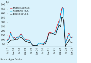 Volatility in sulphur prices has been reduced in the past year following the large price spike and subsequent drop in the summer of 2022. This price volatility has been due to various disrupted seasonal trends from the global pandemic, uneven recovery, geopolitical shifts and demand destruction for fertilizers.